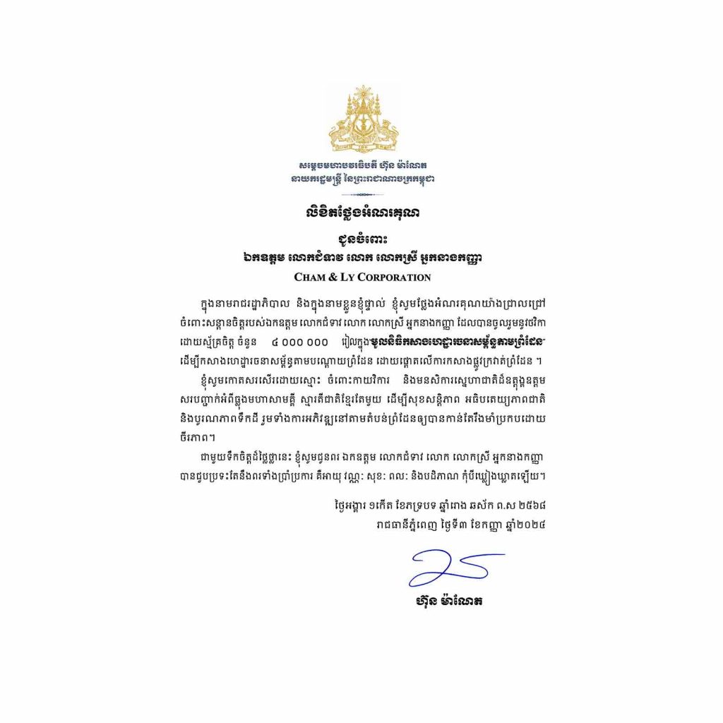 ក្រុមហ៊ុន ចម & លីខបភើរេសិន (ហាងនំប៉័ងប្រ៊េដថក) សូមចូលរួមចំណែក ៤,០០០,០០០រៀល ក្នុង «មូលនិធិកសាងហេដ្ឋារចនាសម្ព័ន្ធតាមព្រំដែន»ដើម្បីកសាងហេដ្ឋារចនាសម្ព័ន្ធ តាមបណ្ដោយព្រំដែន ដោយផ្តោតលេីការកសាងផ្លូវក្រវាត់ព្រំដែន។